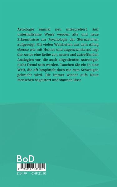 Astrologie einmal neu interpretiert. Auf unterhaltsame Weise werden alte und neue Erkenntnisse zur Psychologie der Sternzeichen aufgezeigt. Mit vielen Weisheiten aus dem Alltag ebenso wie mit Humor und augenzwinkernd legt der Autor eine Reihe von neuen und zutreffenden Analogien vor, die auch altgedienten Astrologen nicht fremd sein werden. Tauchen Sie ein in eine Welt, die oft bespöttelt doch nie zum Schweigen gebracht wird. Die immer wieder aufs Neue Menschen begeistert und staunen lässt.