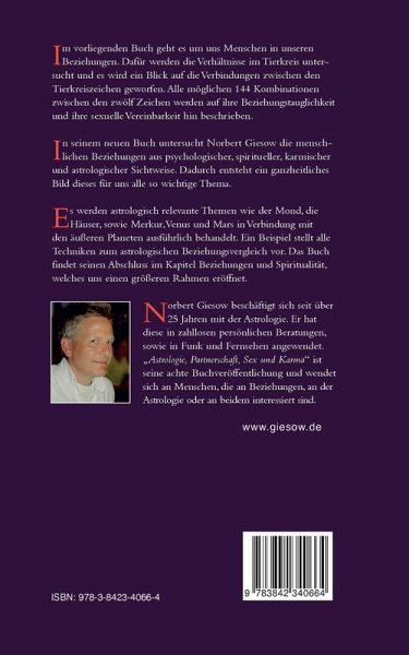 Im vorliegenden Buch geht es um uns Menschen in unseren Beziehungen. Dafür werden die Verhältnisse im Tierkreis untersucht und es wird ein Blick geworfen auf die Verbindungen zwischen den Tierkreiszeichen. Alle möglichen 144 Kombinationen zwischen den zwölf Zeichen werden auf ihre Beziehungstauglichkeit und ihre sexuelle Vereinbarkeit hin beschrieben.In seinem neuen Buch untersucht Norbert Giesow die menschlichen Beziehungen aus psychologischer, spiritueller, karmischer und astrologischer Sichtweise. Dadurch entsteht ein ganzheitliches Bild dieses für uns alle so wichtige Thema.Es werden astrologisch relevante Themen wie der Mond, die Häuser, sowie Merkur, Venus und Mars in Verbindung mit den äußeren Planeten ausführlich behandelt. Ein Beispiel stellt alle Techniken zum astrologischen Beziehungsvergleich vor. Das Buch findet seinen Abschluss im Kapitel Beziehungen und Spiritualität, welches uns einen größeren Rahmen eröffnet.Norbert Giesow beschäftigt sich seit über 25 Jahren mit der Astrologie. Er hat diese in zahllosen persönlichen Beratungen, sowie in Funk und Fernsehen angewendet. "Astrologie, Partnerschaft, Sex und Karma" ist seine achte Buchveröffentlichung und wendet sich an Menschen, die an Beziehungen, an der Astrologie oder an beidem interessiert sind.www.giesow.de