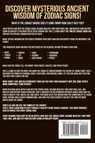 Increase your prosperity, find your soul mate, and take charge of your life! No matter how hard you work, are you still not reaching your true potential? Have you ever come home after a long day at work wishing you could do more with your life? Do you need wisdom and insight to help you achieve success and happiness? An in-Depth Look into the Zodiac Signs: Become Wealthy, Find Your True Love, and Master Your Destiny Using Astrology could be the answer you've been seeking. It explains the powers and characteristics of each of the the 12 zodiac signs and how you can access their wisdom! You'll also learn how to: Find the right job using the zodiac Use cardinal signs, fixed signs, and mutable signs Understand how the four elements connect with the zodiac Find the right match using the zodiac Keep yourself healthy using zodiac chakras Get a copy of Zodiac Signs: Become Wealthy, Find Your True Love, and Master Your Destiny Using Astrology now and start accessing the wisdom of the stars! You'll be so glad you did!