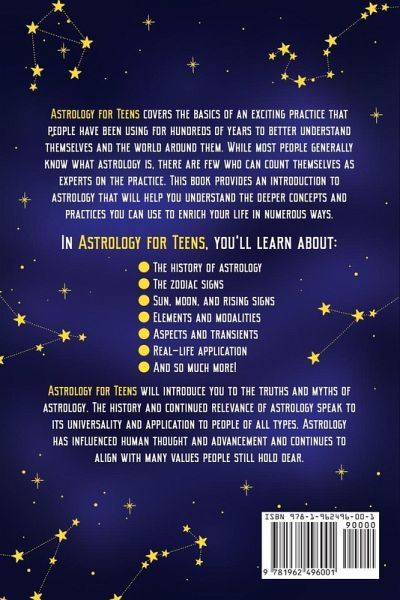 Astrology for Teens covers the basics of an exciting practice that people have been using for hundreds of years to better understand themselves and the world around them. While most people generally know what astrology is, there are few who can count themselves as experts on the practice. This book provides an introduction to astrology that will help you understand the deeper concepts and practices you can use to enrich your life in numerous ways. In Astrology for Teens, you'll learn about: The history of astrology The zodiac signs Sun, moon, and rising signs Elements and modalities Aspects and transients Real-life application And so much more! Astrology for Teens will introduce you to the truths and myths of astrology. The history and continued relevance of astrology speak to its universality and application to people of all types. Astrology has influenced human thought and advancement and continues to align with many values people still hold dear. Are you ready to learn more about astrology?