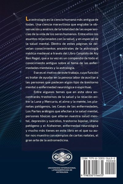 La astrología es la ciencia humana más antigua de todas. Una ciencia maravillosa que engloba la ob- servación y análisis de la totalidad de las experiencias de la vida de los seres humanos. Entre ellos los asuntos relacionados con la salud, y en especial de la salud mental. Dentro de estas páginas se develan conocimientos ancestrales de la astrología médica medieval a través del Libro Conplido de Aly Ben Ragel, que a su vez es un compendio de todo el conocimiento antiguo sobre el tema de las enfer- medades mentales y la astrología. Ese es el motivo de este trabajo, cuya función es tratar de ayudar en la penosa labor de auxiliar a las personas que padecen algún tipo de trastorno mental o enfermedad neurológica o espiritual. Entre algunos temas que en esta obra en- contrarás; trastornos de la salud y la relación en- tre la Luna y Mercurio, el alma y la mente, los planetas patógenos, las Casas de las enfermedades, Los Partes arábigos que afectan a la salud mental, personas tóxicas que alteran nuestra salud mental, depresión y suicidios, trastorno bipolar, Urano patógeno y el Alzheimer, enfermedad neurológica y mucho más tienes en este libro en el que su au- tor nos muestra con ejemplos de cartas natales, el gran arte de la astromedicina.
