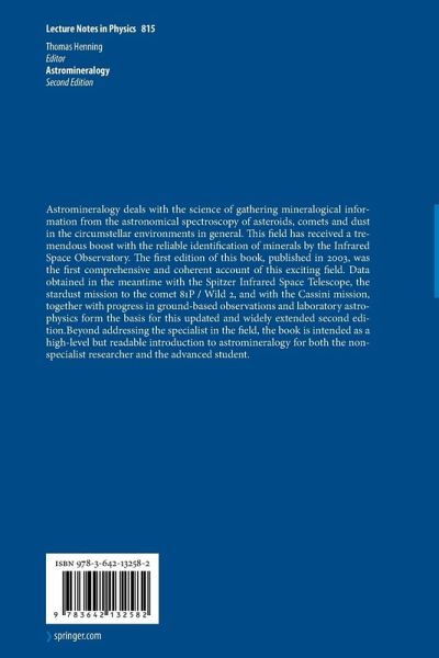 Astromineralogy deals with the science of gathering mineralogical information from the astronomical spectroscopy of asteroids, comets and dust in the circumstellar environments in general. This field has received a tremendous boost with the reliable identification of minerals by the Infrared Space Observatory. The first edition of this book, published in 2003, was the first comprehensive and coherent account of this exciting field. Data obtained in the meantime with the Spitzer Infrared Space Telescope, the stardust mission to the comet 81P / Wild 2, and with the Cassini mission, together with progress in ground-based observations and laboratory astrophysics form the basis for this updated and widely extended second edition.