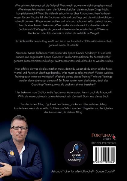 Alexander Maria Faßbender® ist Founder der Space Coach Academy®. Er und viele andere sind sogenannte Space Coaches®, AstronautTrainer for MentalPsyche(c) . Diese trainieren zukünftige Weltraumtouristen und solche, die es werden wollen. Hier erfährst du, was du alles machen musst, damit du weißt, ob du eine solche Reise mental und psychisch überhaupt bestehst. Was musst du alles machen? Warum und welches Training auch immer so wichtig ist? Weshalb genau dieses Training? Welche Trainings werden denn überhaupt gemacht? Ein Ticket kaufen kann doch jeder, doch das Coaching/Training musst du doch erst einmal bestehen. Hier bekommt man Einblick in die Psyche von Astronauten. Kannst du auch Astronaut? Willst du wissen, ob auch du ein Astronaut sein könntest? Dann lies dieses Buch. Transfer in den Alltag: Egal welches Training, du kannst alles in deinen Alltag transferieren, wenn du es willst. Profitiere zusätzlich von den Fähigkeiten und Fertigkeiten der Astronauten für deinen Alltag.