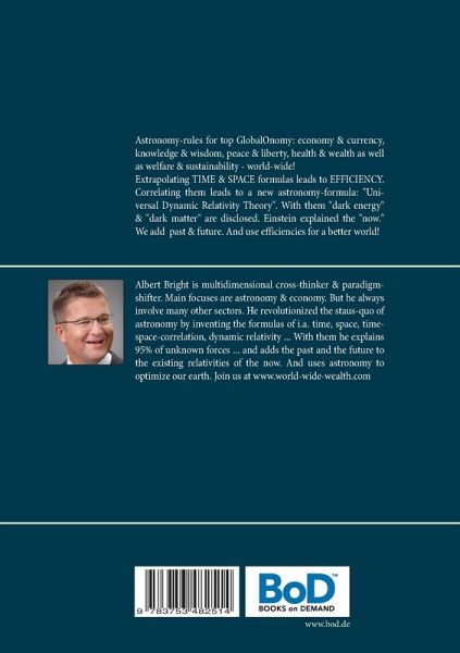 Astronomy-rules for a better GlobalOnomy: economy & currency, knowledge & wisdom, peace & liberty, health & wealth as well as welfare & sustainability - world-wide! Extrapolating the invented formulas of TIME and SPACE lead to extreme EFFICIENCY aspects. And correlating SPACE and TIME leads to a new astronomy-formula: "Universal Dynamic Relativity Theory".With these formulas now "dark energy" (72% of up-to-date un-known energy-forces: Why does universe grow so fast?) is disclosed and our"dark matter" -approach (explaining 23% of un-known forces: Why do planets not orbit faster?) is verified. Whereas Albert Einstein`s formulas explain the "now", we now explain as well the past and the future of universe.Whereas humanity focuses on matter, gravity, time and 3-D-aspects - astronomy focuses on energy, "growth", (energetic) SPACE and efficiency - leading to far mor sustainability.In this book many attempts are made, to transfer all astronomic inventions to improve earthly challenges.