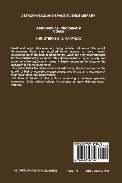 1 Introduction.- 1.1 The quantum nature of light.- 1.2 Photometric concepts and radiometric quantities.- 1.3 Natural sources of diffuse illumination.- 1.4 Detectors.- 1.5 The most versatile detector of light images.- 1.6 Ancient catalogues.- 1.7 Definition of the magnitude scale.- 1.8 The perception of colors.- 1.9 Colors and visual observations.- 1.10 Major sources of errors in ancient visual observations.- 1.11 Magnitude.- 1.12 Magnitude systems.- 1.13 Bolometric magnitude.- 1.14 Apparent and absolute magnitudes.- 1.15 Color index.- 1.16 Characteristics of the photometric response curve.- 2 The telescope.- 2.1 Types.- 2.2 Requirements and specifications.- 3 Photoelectric photometers.- 3.1 Types of photoelectric photometers.- 3.2 The sequential photometer.- 3.3 The simultaneous photometer.- 3.4 The multi-star photometer.- 4 The photomultiplier.- 4.1 The photoelectric effect.- 4.2 Types of photomultipliers.- 4.3 The essential parts of a photomultiplier tube.- 4.4 Anode current and its measurement.- 4.5 Characteristics of photomultipliers.- 5 Photometric filters.- 5.1 Fundamental characteristics.- 5.2 Gelatin filters.- 5.3 Glass filters.- 5.4 Interference filters.- 5.5 Custom-design filters.- 5.6 Image-quality filters.- 5.7 Neutral-density filters.- 5.8 Circular variable filters.- 6 Atmospheric extinction.- 6.1 Absorption, scattering and dispersion of light.- 6.2 Monochromatic extinction.- 6.3 Definition of the air mass.- 6.4 Calculation of the air mass.- 6.5 Heterochromatic extinction.- 6.6 Conclusions.- 7 Atmospheric turbulence: scintillation and seeing.- 7.1 Scintillation.- 7.2 Seeing.- 8 Color transformation.- 8.1 Introduction.- 8.2 Narrow-band photometry.- 8.3 The general color-transformation problem.- 9 Interstellar extinction.- 9.1 Monochromatic extinction.- 9.2 Wide-band extinction.- 10 Principles of data analysis.- 10.1 Introduction.- 10.2 Monochromatic photometry.- 10.3 Multifilter photometry.- 10.4 General remarks.- 10.5 Examples of reduction algorithms.- 11 Homogenization.- 11.1 Introduction.- 11.2 Conformity.- 11.3 Homogenization.- 11.4 Merging data from a single system.- 11.5 Conclusions.- 12 Infrared photometry.- 12.1 Introduction.- 12.2 Chopping and nodding.- 12.3 The detector.- 12.4 The photometer.- 12.5 Observation and reduction of infrared data.- 12.6 Day-time observing.- 13 Charge-coupled devices.- 13.1 Introduction.- 13.2 The detector.- 13.3 The camera.- 13.4 Characteristics of CCDs.- 13.5 Extraction of data from a frame.- 13.6 Aperture photometry.- 13.7 Profile fitting.- 13.8 Extinction.- 13.9 Color transformation.- 14 Photographic photometry.- 14.1 Introduction.- 14.2 The photographic emulsion as a storage medium.- 14.3 The characteristic curve.- 14.4 Post-observational processing of plates and films.- 14.5 Calibration of digitally recorded photographic densities.- 14.6 Photometric analysis of photographic intensities.- 15 The observations.- 15.1 Introduction.- 15.2 Preparing the observing run.- 15.3 Programme scheduling.- 15.4 Evaluation of the quality of the signal for non-imaging detectors.- 15.5 Noise and error on sky background.- 15.6 Some practical hints.- 16 Photometric systems.- 16.1 Introduction.- 16.2 The visual system.- 16.3 Photographic systems.- 16.4 Photoelectric systems.- 16.5 Absolute calibration.- Appendix A. References.- Appendix B. Glossary.- Appendix C. Symbols and notations.- Appendix D. Index.