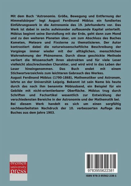 Mit dem Buch \"Astronomie. Größe, Bewegung und Entfernung der Himmelskörper\" legt August Ferdinand Möbius ein fundiertes Einführungswerk in die Astronomie des 19. Jahrhunderts vor. Das Werk ist dabei in sechs aufeinander aufbauende Kapitel unterteilt. Möbius beginnt seine Darstellung mit der Erde, geht dann zum Mond und zu den weiteren Planeten über, um zum Abschluss des Buches Kometen, Meteore und Fixsterne zu thematisieren. Der Autor kontrastiert dabei die naturwissenschaftliche Beschreibung der Vorgänge immer wieder mit der alltäglichen, menschlichen Wahrnehmung der Phänomene. Durch diese geschickte Methode verliert die Wissenschaft ihren abstrakten und für viele Leser vielleicht abschreckenden Charakter, und wird wird in das Leben der Leser hineingenommen. Das Buch endet mit einem Stichwortverzeichnis zum leichteren Gebrauch des Werkes.