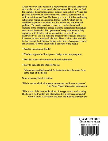 The first edition of this very successful book was a winner of the Astronomical Society of the Pacific's "Astronomy Book of the Year" award in 1986. The popularity of the book's programs is based on the ease with which the amateur astronomer can perform calculations on a personal computer. The routines are not specific to any make of computer and are user-oriented in that they utilize a simple version of the BASIC programming language and require only a broad understanding of any particular problem. Seven new subroutines in this new edition can be linked in any combination with the existing twenty-six. Since the programs themselves take care of details, they can be used, for example, to calculate the time of rising of any of the planets in any part of the world at any time in the future or past, or they may be used to find the circumference of the next solar eclipse visible from a particular place. In fact, almost every problem likely to be encountered by the amateur astronomer can be solved by a suitable combination of the routines given in this book. Peter Duffett-Smith is the author of another popular astronomy book: Astronomy with Your Calculator (3rd Edition), also published by Cambridge University Press.