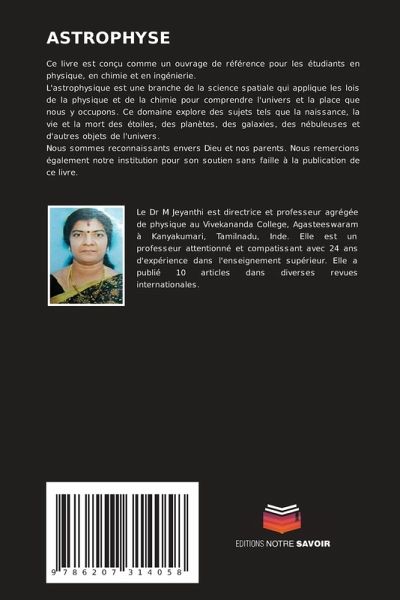 Ce livre est conçu comme un ouvrage de référence pour les étudiants en physique, en chimie et en ingénierie.L'astrophysique est une branche de la science spatiale qui applique les lois de la physique et de la chimie pour comprendre l'univers et la place que nous y occupons. Ce domaine explore des sujets tels que la naissance, la vie et la mort des étoiles, des planètes, des galaxies, des nébuleuses et d'autres objets de l'univers.Nous sommes reconnaissants envers Dieu et nos parents. Nous remercions également notre institution pour son soutien sans faille à la publication de ce livre.