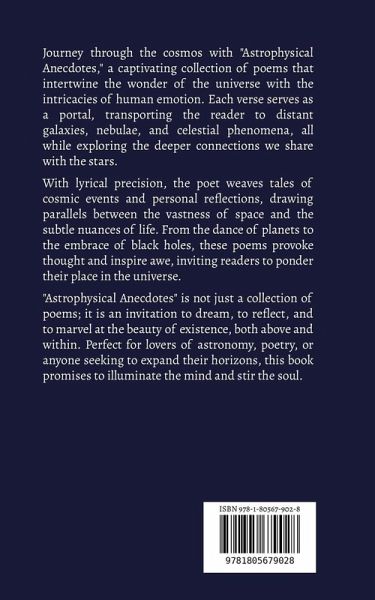 Journey through the cosmos with "Astrophysical Anecdotes," a captivating collection of poems that intertwine the wonder of the universe with the intricacies of human emotion. Each verse serves as a portal, transporting the reader to distant galaxies, nebulae, and celestial phenomena, all while exploring the deeper connections we share with the stars. With lyrical precision, the poet weaves tales of cosmic events and personal reflections, drawing parallels between the vastness of space and the subtle nuances of life. From the dance of planets to the embrace of black holes, these poems provoke thought and inspire awe, inviting readers to ponder their place in the universe. "Astrophysical Anecdotes" is not just a collection of poems; it is an invitation to dream, to reflect, and to marvel at the beauty of existence, both above and within. Perfect for lovers of astronomy, poetry, or anyone seeking to expand their horizons, this book promises to illuminate the mind and stir the soul.