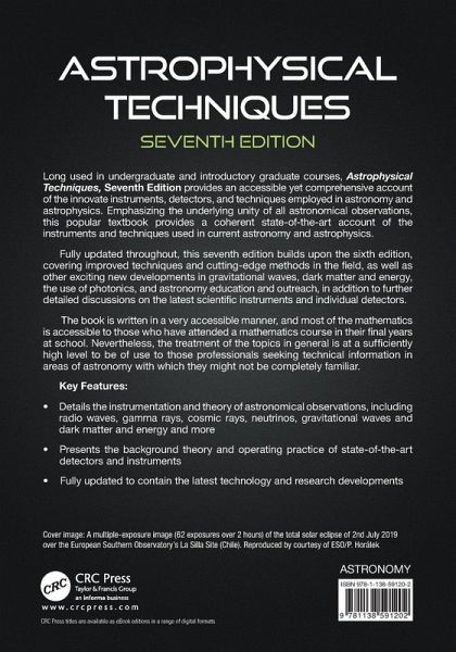 Long used in undergraduate and introductory graduate courses, Astrophysical Techniques, Seventh Edition provides an accessible yet comprehensive account of the innovate instruments, detectors, and techniques employed in astronomy and astrophysics. Emphasizing the underlying unity of all astronomical observations, this popular textbook provides a coherent state-of-the-art account of the instruments and techniques used in current astronomy and astrophysics.
