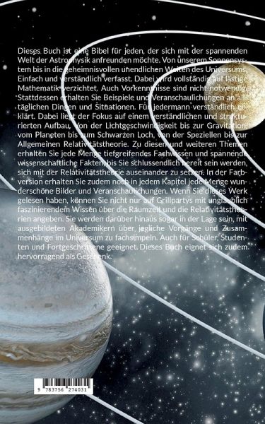 Astrophysik für AnfängerÜberarbeitete und erweiterte Neuauflage von Juli 2022Dieses Buch ist eine Bibel für jeden, der sich mit der spannenden Welt der Astrophysik anfreunden möchte. Von unserem Sonnensystem bis in die geheimnisvollen unendlichen Weiten des Universums. Einfach und verständlich verfasst. Dabei wird vollständig auf lästige Mathematik verzichtet. Auch Vorkenntnisse sind nicht notwendig. Stattdessen erhalten Sie Beispiele und Veranschaulichungen an alltäglichen Dingen und Situationen. Für jedermann verständlich erklärt. Dabei liegt der Fokus auf einem verständlichen und strukturierten Aufbau. Von der Lichtgeschwindigkeit bis zur Gravitation, vom Planeten bis zum Schwarzen Loch, von der Speziellen bis zur Allgemeinen Relativitätstheorie. Zu diesen und weiteren Themen erhalten Sie jede Menge tiefgreifendes Fachwissen und spannende wissenschaftliche Fakten, bis Sie schlussendlich bereit sein werden, sich mit der Relativitätstheorie auseinander zu setzen. In der Farbversion erhalten Sie zudem noch in jedem Kapitel jede Menge wunderschöne Bilder und Veranschaulichungen. Wenn Sie dieses Werk gelesen haben, können Sie nicht nur auf Grillpartys mit unglaublich faszinierendem Wissen über die Raumzeit und die Relativitätstheorien angeben. Sie werden darüber hinaus sogar in der Lage sein, mit ausgebildeten Akademikern über jegliche Vorgänge und Zusammenhänge im Universum zu fachsimpeln. Auch für Schüler, Studenten und Fortgeschrittene geeignet. Dieses Buch eignet sich zudem hervorragend als Geschenk.eBook: 4,99Basisversion: 15,99Farbversion mit Bildern: 24,99(Die Farbversion wird mit hochwertigem Premiumpapier hergestellt und komplett in Farbe gedruckt.)Themen und Inhalte:Astrophysik, Astronomie, Kosmologie, Astrobiologie, Lichtgeschwindigkeit, Gravitation, Galaxien, Sonnensystem, Sterne, Neutronensterne, Planeten, Exoplaneten, Die Sonne, Nachbarsterne, Supernovae, Schwarze Löcher, Weiße Löcher, Wurmlöcher, Zeitreisen, Lichtgeschwindigkeitsreisen, Raumzeit, Universum, Urknall, Massen, Dunkle Materie, Dunkle Energie, Spezielle Relativitätstheorie, Allgemeine Relativitätstheorie, Raumzeitkrümmung, Zeitdilatation, Längenkontraktion, Außerirdisches Leben, Alternative Antriebe
