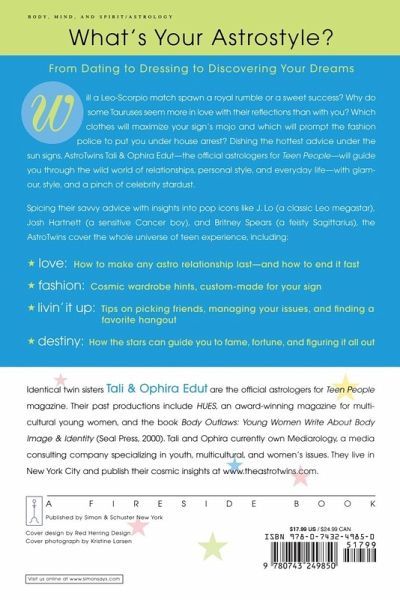 What's Your Astrostyle? From Dating to Dressing to Discovering Your Dreams Will a Leo-Scorpio match spawn a royal rumble or a sweet success? Why do some Tauruses seem more in love with their reflections than with you? Which clothes will maximize your sign's mojo and which will prompt the fashion police to put you under house arrest? Dishing the hottest advice under the sun signs, AstroTwins Tali & Ophira Edut -- the official astrologers for Teen People -- will guide you through the wild world of relationships, personal style, and everyday life -- with glamour, style, and a pinch of celebrity stardust. Spicing their savvy advice with insights into pop icons like J. Lo (a classic Leo megastar), Josh Hartnett (a sensitive Cancer boy), and Britney Spears (a feisty Sagittarius), the AstroTwins cover the whole universe of teen experience, including: * Love: How to make any astro relationship last -- and how to end it fast * Fashion: Cosmic wardrobe hints, custom-made for your sign * Livin' it up: Tips on picking friends, managing your issues, and finding a favorite hangout * Destiny: How the stars can guide you to fame, fortune, and figuring it all out