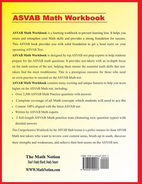 Prepare for The ASVAB Math Test with a Perfect Workbook! ASVAB Math Workbook is a learning workbook to prevent learning loss. It helps you retain and strengthen your Math skills and provides a strong foundation for success. This ASVAB book provides you with solid foundation to get a head starts on your upcoming ASVAB Test. ASVAB Math Workbook is designed by top ASVAB test prep experts to help students prepare for the ASVAB math questions. It provides test-takers with an in-depth focus on the math section of the test, helping them master the essential math skills that test-takers find the most troublesome. This is a prestigious resource for those who need an extra practice to succeed on the ASVAB Math test. ASVAB Math Workbook contains many exciting and unique features to help you score higher on the ASVAB Math test, including: * Over 2,500 ASVAB Math Practice questions with answers * Complete coverage of all Math concepts which students will need to ace the ASVAB test * Content 100% aligned with the latest ASVAB test * Written by ASVAB Math experts * 2 full-length ASVAB Math practice tests (featuring new question types) with detailed answers This Comprehensive Workbook for the ASVAB Math lessons is a perfect resource for those ASVAB Math test takers who want to review core content areas, brush-up in math, discover their strengths and weaknesses, and achieve their best scores on the ASVAB test. Published By: The Math Notion www.mathnotion.com