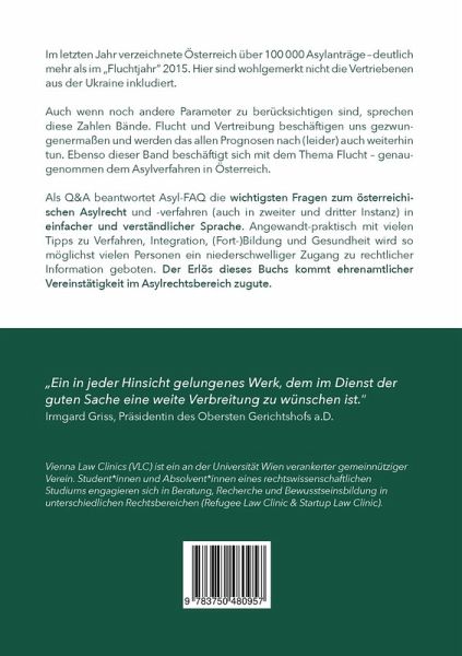 Als Q&A beantwortet Asyl-FAQ die wichtigsten Fragen zum österreichischen Asylrecht und -verfahren (auch in zweiter und dritter Instanz) in einfacher und verständlicher Sprache.Angewandt-praktisch mit vielen Tipps zu Verfahren, Integration, (Fort-)Bildung und Gesundheit wird so möglichst vielen Personen ein niederschwelliger Zugang zu rechtlicher Information geboten.Der Erlös dieses Buchs kommt ehrenamtlicher Vereinstätigkeit im Asylrechtsbereich zugute.Vienna Law Clinics (VLC) ist ein an der Universität Wien verankerter gemeinnütziger Verein. Student_innen und Absolvent_innen eines rechtswissenschaftlichen Studiums engagieren sich in Beratung, Recherche und Bewusstseinsbildung in unterschiedlichen Rechtsbereichen (Refugee Law Clinic & Startup Law Clinic).