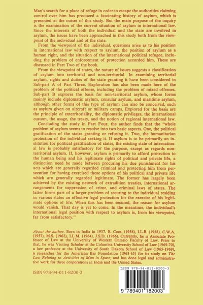 I. Purpose of the inquiry.- One History of Asylum and Basis for Its Grant.- II. History of asylum.- Asylum in Sacred Places.- From Religious Sanctity to Sovereignty.- Later Developments: Political Asylum.- Later Developments: Diplomatic Asylum.- III. Basis for the grant of asylum.- A. Legal Basis.- 1. International law.- a. Territorial asylum.- b. Non-territorial asylum.- 2. National law.- B. Extra-Legal Basis.- Two Asylum from the Viewpoint of the Individual.- IV. The Individual¿s position in international law with respect to asylum.- a. The individual¿s international duties.- b. The individual¿s international rights.- c. The individual¿s right to petition before international organs.- d. The individual¿s procedural ability and amenability before international organs.- a. Views expressed recently by various governments on the nature of the right of asylum.- b. Provision of asylum in national constitutions and legislation.- c. Provision for non-extradition of political offenders in extradition treaties.- a. Surrender not in pursuance of extradition treaty.- b. Surrender in consequence of seizure on foreign territory by the officials of the state of origin.- c. Surrender in consequence of mistake.- V. Asylum as a human right.- VI. The international political refugee.- Who is an International Political Refugee?.- 1. Refugees specified.- 2. Refugee defined.- Refugeehood and Statelessness.- Sources of Law Pertaining to Refugees.- a. Internal sources.- b. International sources.- Treatment of Refugees.- Admission.- Non-expulsion (non-refoulement).- Exemption from reciprocity.- Exemption from exceptional measures.- Applicable law for determining refugee¿s personal status.- Naturalization.- Administrative assistance.- Travel.- a. Documents.- b. Travel for activities other than economic.- c. Travel for economic activities.- Other rights and protection.- Determination of the Refugee Status.- Termination of the Refugee Status.- a. Repatriation.- b. Migration.- c. Assimilation.- Dependents of the Refugee.- Refugee and Extradition.- Enforcement of Rights of Refugees.- International Machinery for Protection of Refugees.- Three Asylum from the Viewpoint of States.- Sub-Part A. Territorial Asylum.- VII. Rights and duties of states granting territorial asylum.- Right of States to Grant Territorial Asylum.- Duties of States Granting Territorial Asylum.- 1. Duty to control the activities of the person to whom asylum is given.- 2. Duty with respect to extradition.- 3. Duty with respect to non-refoulement.- VIII. The political offense.- Growth of the Notion of Political Offense.- Meaning of Political Offense.- 1. Act as part of an organized political activity.- 2. Act committed with predominantly political characteristics.- 3. Act justifying non-extradition in order to avoid political persecution.- The Problem of Mixed Offenses.- 1. The principle of predominant element.- 2. The principle of the attentat clause.- 3. The principle of the unqualified attentat clause.- 4. Murder.- 5. Anarchist offenses.- 6. Acts of communists.- 7. Brutality.- 8. Quislings, traitors, or collaborationists with the enemy.- 9. War criminals.- 10. Revolutionary activities.- 11. Offenses incident to flight from country.- 12. Murder and robbery.- 13. Robbery.- 14. Assault.- 15. Bombings.- 16. Bribery.- 17. Forgery.- 18. Genocide.- 19. Religious offenses.- 20. Terrorism.- 21. The Harvard Research approach.- Sub-Part B. Non-Territorial Asylum.- IX. The forms of non-territorial asylum.- X. Diplomatic asylum.- A. The Principle of Exterritoriality of the Diplomatic Premises as a Basis for Diplomatic Asylum.- B. Diplomatic Privileges as a Basis for Diplomatic Asylum.- C. International Custom as a Basis for Diplomatic Asylum.- 1. Practice of states in Europe.- 2. Practice of the United Kingdom.- 3. Practice of the United States of America.- 4. Practice of states in Asia and Africa.- 5. Practice of states in South and Central America.- Argentina.- Bolivia.- Brazil.- Chile.- Colombia.- Costa Rica.- Cuba.- Dominican Republic.- Ecuador.- El Salvador.- Guatemala.- Haiti.- Honduras.- Mexico.- Nicaragua.- Panama.- Paraguay.- Peru.- Uruguay.- Venezuela.- D. Usage as a Basis for Diplomatic Asylum.- E. Treaty as a Basis for Diplomatic Asylum.- 1. Treaty on international penal law.- 2. Convention on asylum.- 3. Convention on political asylum.- 4. Treaty on political asylum and refuge.- 5. Convention on diplomatic asylum.- F. Regional Customary International Law as a Basis for Diplomatic Asylum.- XI. Consular asylum.- XII. Maritime asylum.- A. Asylum in Public Vessels.- B. Asylum in Private Vessels.- Four Conclusion.- XIII. Summary and conclusions.