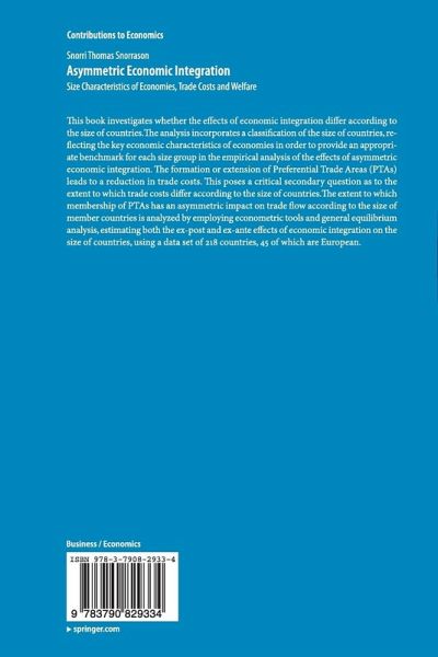 This book investigates whether the effects of economic integration differ according to the size of countries. The analysis incorporates a classification of the size of countries, reflecting the key economic characteristics of economies in order to provide an appropriate benchmark for each size group in the empirical analysis of the effects of asymmetric economic integration. The formation or extension of Preferential Trade Areas (PTAs) leads to a reduction in trade costs. This poses a critical secondary question as to the extent to which trade costs differ according to the size of countries. The extent to which membership of PTAs has an asymmetric impact on trade flow according to the size of member countries is analyzed by employing econometric tools and general equilibrium analysis, estimating both the ex-post and ex-ante effects of economic integration on the size of countries, using a data set of 218 countries, 45 of which are European. ?