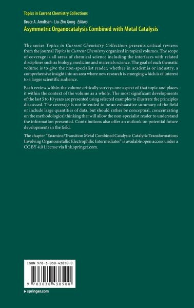 The series Topics in Current Chemistry Collections presents critical reviews from the journal Topics in Current Chemistry organized in topical volumes. The scope of coverage is all areas of chemical science including the interfaces with related disciplines such as biology, medicine and materials science. The goal of each thematic volume is to give the non-specialist reader, whether in academia or industry, a comprehensive insight into an area where new research is emerging which is of interest to a larger scientific audience.Each review within the volume critically surveys one aspect of that topic and places it within the context of the volume as a whole. The most significant developments of the last 5 to 10 years are presented using selected examples to illustrate the principles discussed. The coverage is not intended to be an exhaustive summary of the field or include large quantities of data, but should rather be conceptual, concentrating on the methodological thinking that will allow the non-specialist reader to understand the information presented. Contributions also offer an outlook on potential future developments in the field.The chapter "Enamine/Transition Metal Combined Catalysis: Catalytic Transformations Involving Organometallic Electrophilic Intermediates" is available open access under a CC BY 4.0 License via link.springer.com.