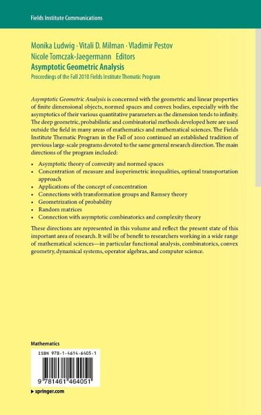 Asymptotic Geometric Analysis is concerned with the geometric and linear properties of finite dimensional objects, normed spaces, and convex bodies, especially with the asymptotics of their various quantitative parameters as the dimension tends to infinity. The deep geometric, probabilistic, and combinatorial methods developed here are used outside the field in many areas of mathematics and mathematical sciences. The Fields Institute Thematic Program in the Fall of 2010 continued an established tradition of previous large-scale programs devoted to the same general research direction. The main directions of the program included: