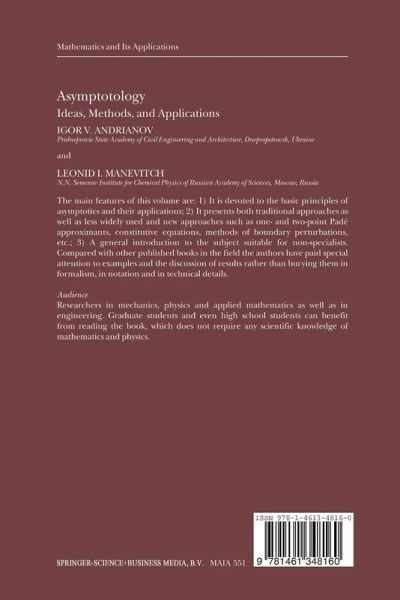 Asymptotic methods belong to the, perhaps, most romantic area of modern mathematics. They are widely known and have been used in me chanics, physics and other exact sciences for many, many decades. But more than this, asymptotic ideas are found in all branches of human knowledge, indeed in all areas of life. In this broader context they have not and perhaps cannot be fully formalized. However, they are mar velous, they leave room for fantasy, guesses and intuition; they bring us very near to the border of the realm of art. Many books have been written and published about asymptotic meth ods. Most of them presume a mathematically sophisticated reader. The authors here attempt to describe asymptotic methods on a more accessi ble level, hoping to address a wider range of readers. They have avoided the extreme of banishing formulae entirely, as done in some popular science books that attempt to describe mathematical methods with no mathematics. This is impossible (and not wise). Rather, the authors have tried to keep the mathematics at a moderate level. At the same time, using simple examples, they think they have been able to illustrate all the key ideas of asymptotic methods and approaches, to depict in de tail the results of their application to various branches of knowledg- from astronomy, mechanics, and physics to biology, psychology and art. The book is supplemented by several appendices, one of which con tains the profound ideas of R. G.