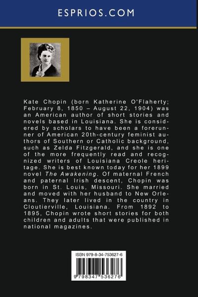Kate Chopin (born Katherine O'Flaherty; February 8, 1850 - August 22, 1904) was an American author of short stories and novels based in Louisiana. She is considered by scholars to have been a forerunner of American 20th-century feminist authors of Southern or Catholic background, such as Zelda Fitzgerald, and she is one of the more frequently read and recognized writers of Louisiana Creole heritage. She is best known today for her 1899 novel The Awakening. Of maternal French and paternal Irish descent, Chopin was born in St. Louis, Missouri. She married and moved with her husband to New Orleans. They later lived in the country in Cloutierville, Louisiana. From 1892 to 1895, Chopin wrote short stories for both children and adults that were published in national magazines.