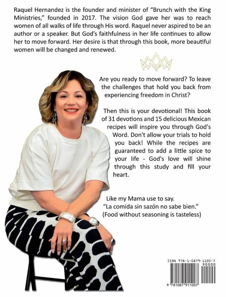 Are you ready to move forward? To leave the challenges that hold you back from experiencing freedom in Christ? Then this is your devotional! This book of 31 devotions and 15 delicious Mexican recipes will inspire you through God's word. Don't allow your trials to hold you back! While the recipes are guaranteed to add a little spice to your life - God's love will shine through this study and fill your heart. Like my Mama use to say. "La comida sin sazón no sabe bien" (Food without the right seasoning is tasteless)Bio Raquel Hernandez is the founder and Minister of "Brunch with the King Ministries" Founded in in 2017. The vision God gave her was to reach women of ALL walks of life through His word. Never aspired to be an author or speaker. But Gods faithfulness in her life continues to allow her to move forward. Her desire Is that through this book more beautiful women are changed and renewed.