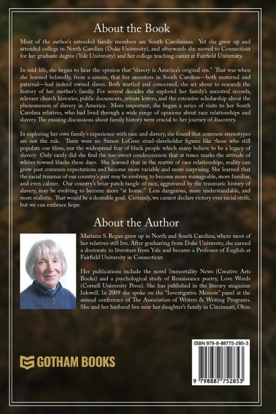 Most of the author's extended family members are South Carolinians. Yet she grew up and attended college in North Carolina (Duke University), and afterwards she moved to Connecticut for her graduate degree (Yale University) and her college teaching career at Fairfield University. In mid-life, she began to hear the opinion that "slavery is America's original sin". That was when she learned belatedly, from a cousin, that her ancestors in South Carolina- both maternal and paternal - had indeed owned slaves. both startled and connected, she set about to research the history of her mother's family. For several decades she explored her family's ancestral records, relevant church histories, public documents, private letters, and the extensive scholarship about the phenomenon of slavery in America. More important, she began a series of visits to her South Carolina relatives, who had lived through a wide range of opinions about race relationships and slavery. The ensuing discussions about family history were crucial to her journey of discovery. In exploring her own family's experience with race and slavery, she found that common stereotypes are not the rule. There were no Simon LeGree cruel-slaveholder figures like those who still populate our films, nor the widespread fear of black people which many believe to be a legacy of slavery. Only rarely did she find the too-sweet condescension that at times marks the attitude of whites toward blacks these days. She learned that in the matter of race relationships, reality can grow past common expectations and become more variable and more surprising. She learned that the racial traumas of our country's past may be evolving to become more manageable, more familiar, and even calmer. Our country's briar-patch tangle of race, aggravated by the traumatic history of slavery, may be evolving to become more "at home". Less dangerous, more understandable, and more realistic. That would be a desirable goal. Certainly, we cannot declare victory over racial strife, but we can embrace hope.