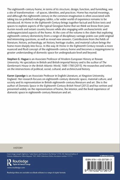 Stephen G. Hague is an Associate Professor of Modern European History at Rowan University. He specializes in British and British imperial history and is the author of The Gentleman's House in the British Atlantic World, 1680-1780 (2015). He researches and writes on the intersections of political, social, cultural, and architectural history. Karen Lipsedge is an Associate Professor in English Literature, at Kingston University, England. Her research focuses on eighteenth-century domestic space, material culture, and society and its representation in British eighteenth-century literature and art. She is the author of Domestic Space in the Eighteenth-Century British Novel (2012) and has written and presented widely on the representation of home, the interior, and the lived experience of domestic space in eighteenth-century literature and art.