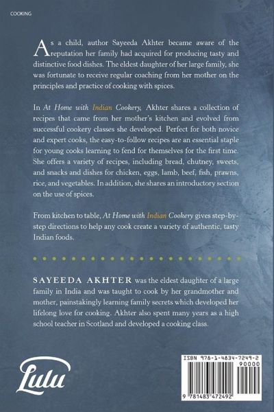 As a child, author Sayeeda Akhter became aware of the reputation her family had acquired for producing tasty and distinctive food dishes. The eldest daughter of her large family, she was fortunate to receive regular coaching from her mother on the principles and practice of cooking with spices. In At Home with Indian Cookery, Akhter shares a collection of recipes that came from her mother's kitchen and evolved from successful cookery classes she developed. Perfect for both novice and expert cooks, the easy-to-follow recipes are an essential staple for young cooks learning to fend for themselves for the first time. She offers a variety of recipes, including bread, chutney, sweets, and snacks and dishes for chicken, eggs, lamb, beef, fish, prawns, rice, and vegetables. In addition, she shares an introductory section on the use of spices. From kitchen to table, At Home with Indian Cookery gives step-by-step directions to help any cook create a variety of authentic, tasty Indian foods.