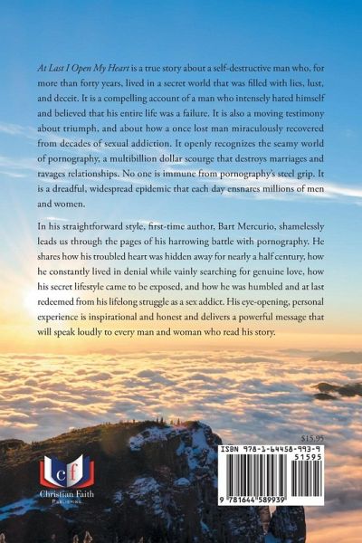At Last I Open My Heart is a true story about a self-destructive man who, for more than forty years, lived in a secret world that was filled with lies, lust, and deceit. It is a compelling account of a man who intensely hated himself and believed that his entire life was a failure. It is also a moving testimony about triumph, and about how a once lost man miraculously recovered from decades of sexual addiction. It openly recognizes the seamy world of pornography, a multibillion dollar scourge that destroys marriages and ravages relationships. No one is immune from pornography's steel grip. It is a dreadful, widespread epidemic that each day ensnares millions of men and women. In his straightforward style, first-time author, Bart Mercurio, shamelessly leads us through the pages of his harrowing battle with pornography. He shares how his troubled heart was hidden away for nearly a half century, how he constantly lived in denial while vainly searching for genuine love, how his secret lifestyle came to be exposed, and how he was humbled and at last redeemed from his lifelong struggle as a sex addict. His eye-opening, personal experience is inspirational and honest and delivers a powerful message that will speak loudly to every man and woman who read his story.