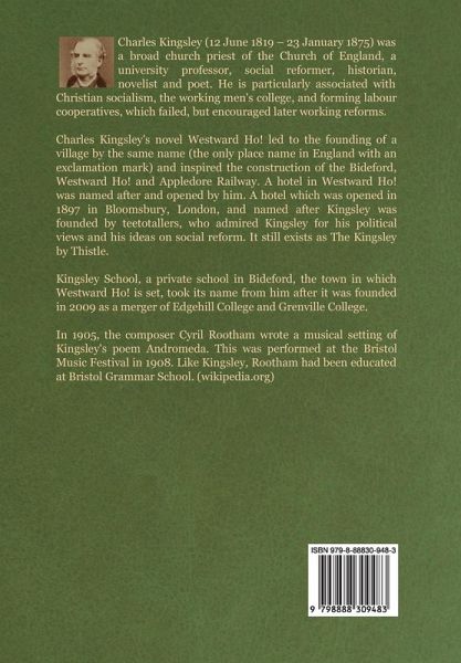 About the author: Charles Kingsley (12 June 1819 - 23 January 1875) was a broad church priest of the Church of England, a university professor, social reformer, historian, novelist and poet. He is particularly associated with Christian socialism, the working men's college, and forming labour cooperatives, which failed, but encouraged later working reforms. Charles Kingsley's novel Westward Ho! led to the founding of a village by the same name (the only place name in England with an exclamation mark) and inspired the construction of the Bideford, Westward Ho! and Appledore Railway. A hotel in Westward Ho! was named after and opened by him. A hotel which was opened in 1897 in Bloomsbury, London, and named after Kingsley was founded by teetotallers, who admired Kingsley for his political views and his ideas on social reform. It still exists as The Kingsley by Thistle. Kingsley School, a private school in Bideford, the town in which Westward Ho! is set, took its name from him after it was founded in 2009 as a merger of Edgehill College and Grenville College. In 1905, the composer Cyril Rootham wrote a musical setting of Kingsley's poem Andromeda. This was performed at the Bristol Music Festival in 1908. Like Kingsley, Rootham had been educated at Bristol Grammar School. (wikipedia.org)