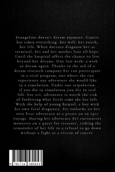 Evangeline doesn't dream anymore. Cancer has taken everything -her will, her youth, her life. When doctors diagnose her as terminal, Evi and her mother lose all hope. Until the hospital offers the chance to live beyond her dreams. One last wish: a wish to dream again. Thanks to the aid of a dream research company Evi can participate in a trial program, one where she can experience any adventure she would like in a simulation. Under one stipulation. Evi risks death in reality if she dies in simulation, possibly forfeiting what little time she has left. With the help of young Remiel, a boy with his own fatal diagnosis, Evi embarks on her very first adventure as a pirate on an epic voyage. During her adventure Evi encounters monsters on a quest for treasure, risking the remainder of her life in a refusal to go down without a fight as a victim of cancer.