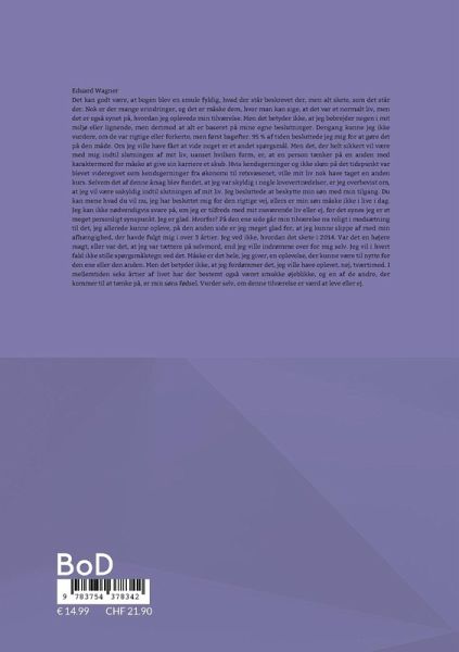 Eduard Wagner Det kan godt være, at bogen blev en smule fyldig, hvad der står beskrevet der, men alt skete, som det står der. Nok er der mange erindringer, og det er måske dem, hvor man kan sige, at det var et normalt liv, men det er også synet på, hvordan jeg oplevede min tilværelse. Men det betyder ikke, at jeg bebrejder nogen i mit miljø eller lignende, men derimod at alt er baseret på mine egne beslutninger. Dengang kunne jeg ikke vurdere, om de var rigtige eller forkerte, men først bagefter. 95 % af tiden besluttede jeg mig for at gøre det på den måde. Om jeg ville have fået at vide noget er et andet spørgsmål. Men det, der helt sikkert vil være med mig indtil slutningen af mit liv, uanset hvilken form, er, at en person tænker på en anden med karaktermord for måske at give sin karriere et skub. Hvis kendsgerninger og ikke skøn på det tidspunkt var blevet videregivet som kendsgerninger fra økonomi til retsvæsenet, ville mit liv nok have taget en anden kurs. Selvom det af denne årsag blev fundet, at jeg var skyldig i nogle lovovertrædelser, er jeg overbevist om, at jeg vil være uskyldig indtil slutningen af mit liv. Jeg besluttede at beskytte min søn med min tilgang. Du kan mene hvad du vil nu, jeg har besluttet mig for den rigtige vej, ellers er min søn måske ikke i live i dag. Jeg kan ikke nødvendigvis svare på, om jeg er tilfreds med mit nuværende liv eller ej, for det synes jeg er et meget personligt synspunkt. Jeg er glad. Hvorfor? På den ene side går min tilværelse nu roligt i modsætning til det, jeg allerede kunne opleve, på den anden side er jeg meget glad for, at jeg kunne slippe af med min afhængighed, der havde fulgt mig i over 3 årtier. Jeg ved ikke, hvordan det skete i 2014. Var det en højere magt, eller var det, at jeg var tættere på selvmord, end jeg ville indrømme over for mig selv. Jeg vil i hvert fald ikke stille spørgsmålstegn ved det. Måske er det hele, jeg giver, en oplevelse, der kunne være til nytte for den ene eller den anden. Men det betyder ikke, at jeg fordømmer det, jeg ville have oplevet, nej, tværtimod. I mellemtiden seks årtier af livet har der bestemt også været smukke øjeblikke, og en af de andre, der kommer til at tænke på, er min søns fødsel. Vurder selv, om denne tilværelse er værd at leve eller ej.