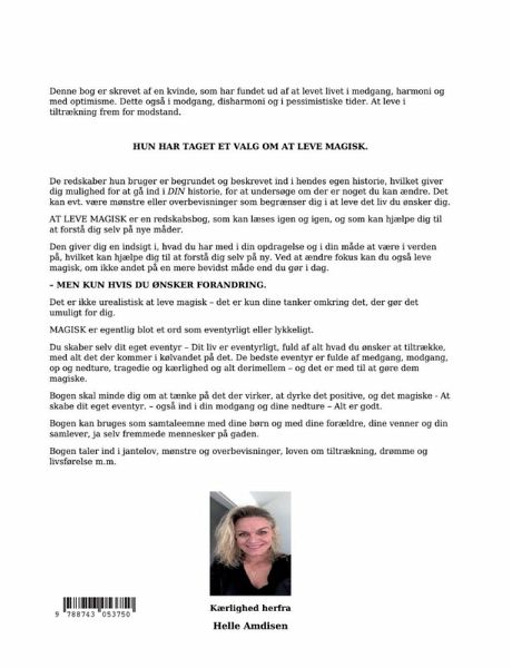 Det er en redskabsbog, som omhandler flere områder som har indflydelse på vores hverdag og livsførelse. For at leve Magisk,er det er vigtigt at forstå følelser. VI er alle ALLE følelser, og det gør os til HELE mennesker. Det er også følelserne der styrer hvilket energiniveau vi bevæger os på i livet. Bogen beskriver både universiel og følelsesmæssig energi. Hvis vi altid kun dyrker de positive følelser, vil vi aldrig mærke dybden i lykke og glæde, som er nogle af de stærkeste positive følelser vi kan have, men kun fordi vi også kender de negative følelser . De mest negative følelser er vrede, frustration, tvivl, depression og sorg. Disse følelser kan være en negativ spiral, som både påvirker os selv, og folk omkring os. Det påvirker den måde vi er i verden på, hvilket påvirker de mennesker vi omgåes. Det er som ringe i vandet. Bogen handler om mønstre og overbevisninger, hvilke er vores egne og hvilke er arvede, og hvordan arbejder vi med dem? Den handler også om Jantelov og dens indflydelse på vores liv, da vi har den med op gennem livet. Begrænser den os selv og andre? - Og hvordan får vi den til at fylde mindre i hverdagen? Bogen arbejder med loven om tiltrækning. Det vi sender ud, er også det vi modtager. Den giver en forkaring på, hvordan forfatteren tolker på det, og hvordan hun bruger det ind i sin egen hverdag. Derudover er hendes egen historie beskrevet og bearbejdet igennem hendes skriftlige eksamensopgave fra studiet til coach og terapeut (2016-2018) Som eksempel, for at gøre det nemmere at bruge redskaberne i bogen.