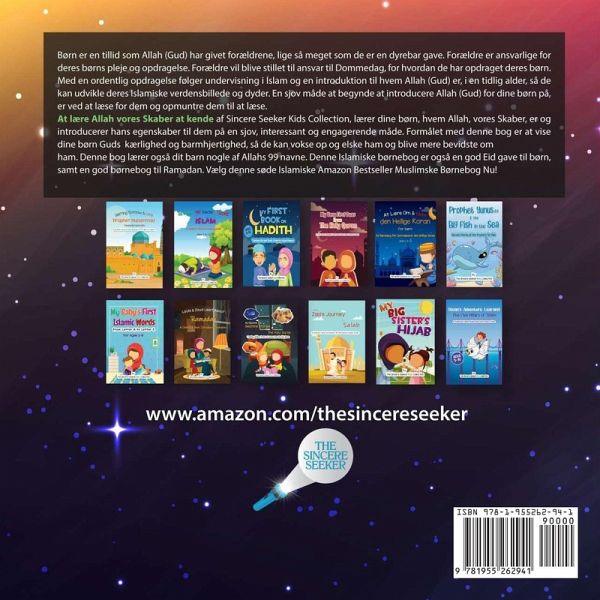 ¿ Børn er en tillid som Allah (Gud) har givet forældrene, lige så meget som de er en dyrebar gave. Forældre er ansvarlige for deres børns pleje og opdragelse. Forældre vil blive stillet til ansvar til Dommedag, for hvordan de har opdraget deres børn. Med en ordentlig opdragelse følger undervisning i Islam og en introduktion til hvem Allah (Gud) er, i en tidlig alder, så de kan udvikle deres Islamiske verdensbillede og dyder. En sjov måde at begynde at introducere Allah (Gud) for dine børn på, er ved at læse for dem og opmuntre dem til at læse. ¿At lære Allah vores Skaber at kende ¿ af Sincere Seeker Kids Collection, lærer dine børn, hvem Allah, vores Skaber, er og introducerer hans egenskaber til dem på en sjov, interessant og engagerende måde. Formålet med denne bog er at vise dine børn Guds kærlighed og barmhjertighed, så de kan vokse op og elske ham og blive mere bevidste om ham. Denne bog lærer også dit barn nogle af Allahs 99 navne. Denne Islamiske børnebog er også en god Eid gave til børn, samt en god børnebog til Ramadan. Vælg denne søde Islamiske Amazon Bestseller Muslimske Børnebog Nu! ¿ ¿¿ Omkring The Sincere Seeker Kids Collection ¿¿ Den mest betydningsfulde og længstvarende arv du kan give dit barn som forælder, er en ordentlig Islamisk opdragelse og viden om Islam. Som forælder skal du lære dine børn om Allah (Gud), den Hellige Koran, Islams religion og livsstil, og om profeten Muhammed, fred være med ham. Enhver forælder bør indgyde interesse & kærlighed til Islam hos sine børn i en tidlig alder, så de kan vokse op med en Islamisk tankegang & livsstil. Alle husstande skal afsætte tid til dagligt at udvikle og dyrke deres børns forbindelse med Allah, for at give næring til deres sjæle. Ligesom vores fysiske kroppe har brug for mad og vand for at vokse og få næring, har vores sjæle brug for at mindes Allah og recitere den Hellige Koran for at berige, nære og give liv til vores sjæle. The Sincere Seeker Kids Collection er designet til at introducere og lære dine børn det vigtigste, de har brug for at vide om Allah (Gud), den Hellige Koran, Islam, profeten Muhammed, fred være med ham, Hadith for børn, De fem søjler for Islams, de 6 trosartikler i Islam, og meget mere på en nem, sjov og lærerig måde. Kærligheden til Allah er allerede til stede i vores børns hjerter, og det er vores pligt som forældre at hjælpe med at udvikle, nære og opretholde denne kærlighed og dette bånd, fra en tidlig alder.