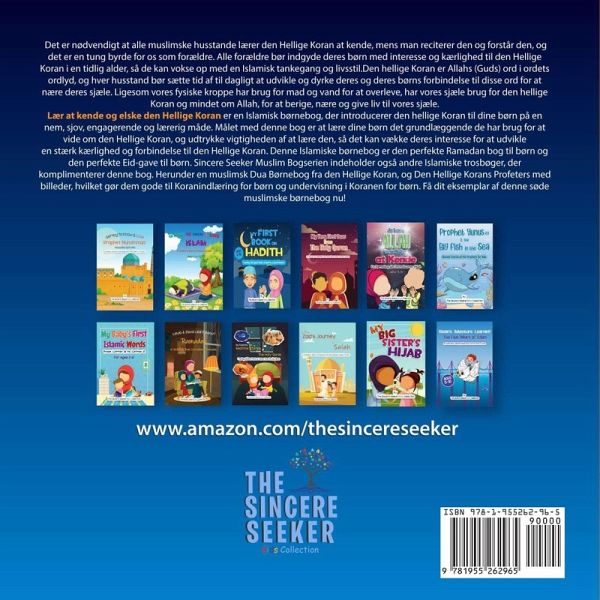 ¿ Det er nødvendigt at alle muslimske husstande lærer den Hellige Koran at kende, mens man reciterer den og forstår den, og det er en tung byrde for os som forældre. Alle forældre bør indgyde deres børn med interesse og kærlighed til den Hellige Koran i en tidlig alder, så de kan vokse op med en Islamisk tankegang og livsstil. Den hellige Koran er Allahs (Guds) ord i ordets ordlyd, og hver husstand bør sætte tid af til dagligt at udvikle og dyrke deres og deres børns forbindelse til disse ord for at nære deres sjæle. Ligesom vores fysiske kroppe har brug for mad og vand for at overleve, har vores sjæle brug for den hellige Koran og mindet om Allah, for at berige, nære og give liv til vores sjæle. ¿ ¿ Lær at kende og elske den Hellige Koran ¿ er en Islamisk børnebog, der introducerer den hellige Koran til dine børn på en nem, sjov, engagerende og lærerig måde. Målet med denne bog er at lære dine børn det grundlæggende de har brug for at vide om den Hellige Koran, og udtrykke vigtigheden af at lære den, så det kan vække deres interesse for at udvikle en stærk kærlighed og forbindelse til den Hellige Koran. Denne Islamiske børnebog er den perfekte Ramadan bog til børn og den perfekte Eid-gave til børn. Sincere Seeker Muslim Bogserien indeholder også andre Islamiske trosbøger, der komplimenterer denne bog. Herunder en muslimsk Dua Børnebog fra den Hellige Koran, og Den Hellige Korans Profeters med billeder, hvilket gør dem gode til Koranindlæring for børn og undervisning i Koranen for børn. Få dit eksemplar af denne søde muslimske børnebog nu! ¿¿ Omkring The Sincere Seeker Kids Collection ¿¿ Som forælder skal du lære dine børn om Allah (Gud), den Hellige Koran, Islams religion og livsstil, og om profeten Muhammed, fred være med ham. Enhver forælder bør indgyde interesse & kærlighed til Islam hos sine børn i en tidlig alder, så de kan vokse op med en Islamisk tankegang & livsstil. Alle husstande skal afsætte tid til dagligt at udvikle og dyrke deres børns forbindelse med Allah, for at give næring til deres sjæle. Ligesom vores fysiske kroppe har brug for mad og vand for at vokse og få næring, har vores sjæle brug for at mindes Allah og recitere den Hellige Koran for at berige, nære og give liv til vores sjæle.