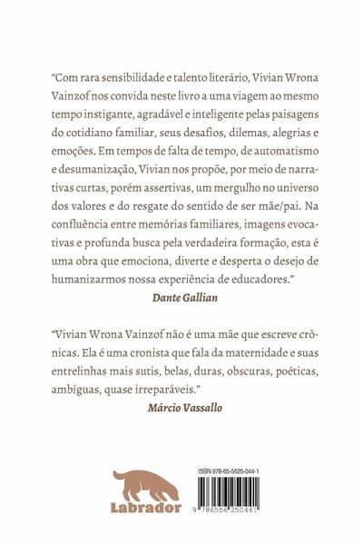 Quando se tem filhos em casa, os anos são vendaval e os dias rastejam longos e medíocres. Quando vejo, os dentes de leite já derramaram, não encontro a chupeta nem as fraldas, e ainda estou impaciente para terminarem o jantar... Amanhã de manhã já pode ter passado mais vinte ou sessenta anos. E eu estarei sentada no jardim, vendo vocês nascerem todos os dias. Vivian Wrona Vainzof nos convida neste livro a uma viagem ao mesmo tempo instigante, agradável e inteligente pelas paisagens do cotidiano familiar, seus desafios, dilemas, alegrias e emoções. Em tempos de falta de tempo, de automatismo e desumanização, Vivian nos propõe, por meio de narrativas curtas, porém assertivas, um mergulho no universo dos valores e do resgate do sentido de ser mãe/pai.
