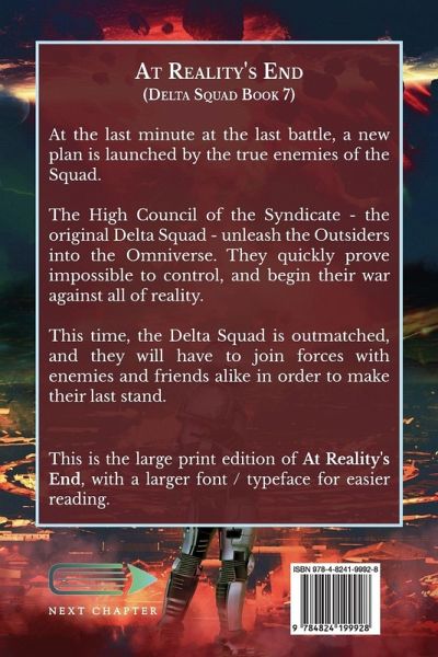 At the last minute at the last battle, a new plan is launched by the true enemies of the Squad. The High Council of the Syndicate - the original Delta Squad - unleash the Outsiders into the Omniverse. They quickly prove impossible to control, and begin their war against all of reality. This time, the Delta Squad is outmatched, and they will have to join forces with enemies and friends alike in order to make their last stand. This is the large print edition of At Reality's End, with a larger font / typeface for easier reading.