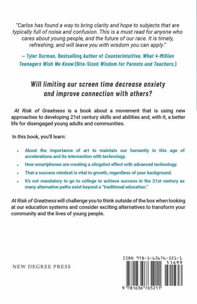 Will limiting our screen time decrease anxiety and improve connection with others? At Risk of Greatness is a book about a movement that is using new approaches to developing 21st century skills and abilities and, with it, a better life for disengaged young adults and communities. In this book, you'll learn: About the importance of art to maintain our humanity in this age of accelerations and its intersection with technology. How smartphones are creating a slingshot effect with advanced technology. That a success mindset is vital to growth, regardless of your background. It's not mandatory to go to college to achieve success in the 21st century as many alternative paths exist beyond a "traditional education." At Risk of Greatness will challenge you to think outside of the box when looking at our education systems and consider exciting alternatives to transform your community and the lives of young people.