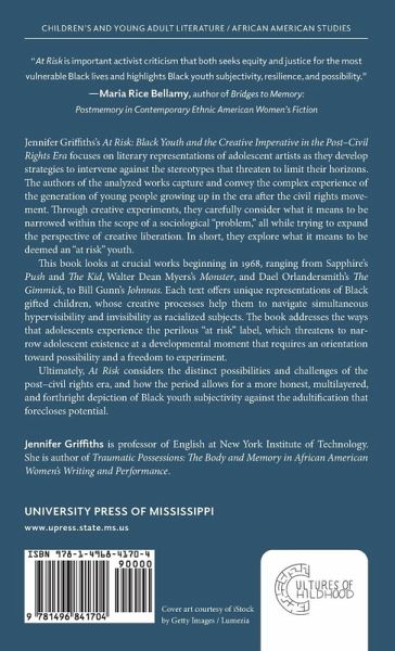 Jennifer Griffiths's At Risk: Black Youth and the Creative Imperative in the Post-Civil Rights Era focuses on literary representations of adolescent artists as they develop strategies to intervene against the stereotypes that threaten to limit their horizons. The authors of the analyzed works capture and convey the complex experience of the generation of young people growing up in the era after the civil rights movement. Through creative experiments, they carefully consider what it means to be narrowed within the scope of a sociological "problem," all while trying to expand the perspective of creative liberation. In short, they explore what it means to be deemed an "at risk" youth. This book looks at crucial works beginning in 1968, ranging from Sapphire's Push and The Kid, Walter Dean Myers's Monster, and Dael Orlandersmith's The Gimmick, to Bill Gunn's Johnnas. Each text offers unique representations of Black gifted children, whose creative processes help them to navigate simultaneous hypervisibility and invisibility as racialized subjects. The book addresses the ways that adolescents experience the perilous "at risk" label, which threatens to narrow adolescent existence at a developmental moment that requires an orientation toward possibility and a freedom to experiment. Ultimately, At Risk considers the distinct possibilities and challenges of the post-civil rights era, and how the period allows for a more honest, multilayered, and forthright depiction of Black youth subjectivity against the adultification that forecloses potential.