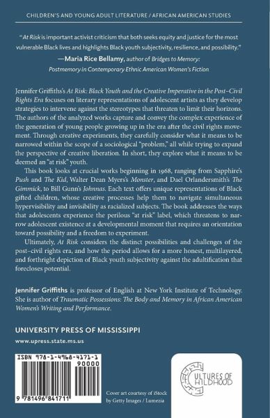 Jennifer Griffiths's At Risk: Black Youth and the Creative Imperative in the Post-Civil Rights Era focuses on literary representations of adolescent artists as they develop strategies to intervene against the stereotypes that threaten to limit their horizons. The authors of the analyzed works capture and convey the complex experience of the generation of young people growing up in the era after the civil rights movement. Through creative experiments, they carefully consider what it means to be narrowed within the scope of a sociological "problem," all while trying to expand the perspective of creative liberation. In short, they explore what it means to be deemed an "at risk" youth. This book looks at crucial works beginning in 1968, ranging from Sapphire's Push and The Kid, Walter Dean Myers's Monster, and Dael Orlandersmith's The Gimmick, to Bill Gunn's Johnnas. Each text offers unique representations of Black gifted children, whose creative processes help them to navigate simultaneous hypervisibility and invisibility as racialized subjects. The book addresses the ways that adolescents experience the perilous "at risk" label, which threatens to narrow adolescent existence at a developmental moment that requires an orientation toward possibility and a freedom to experiment. Ultimately, At Risk considers the distinct possibilities and challenges of the post-civil rights era, and how the period allows for a more honest, multilayered, and forthright depiction of Black youth subjectivity against the adultification that forecloses potential.
