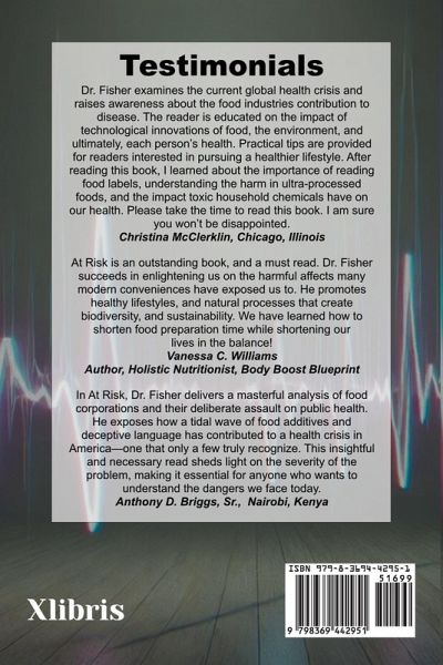 Dr. Fisher examines the current global health crisis and raises awareness about the food industries contribution to disease. The reader is educated on the impact of technological innovations of food, the environment, and ultimately, each person's health. Practical tips are provided for readers interested in pursuing a healthier lifestyle. After reading this book, I learned about the importance of reading food labels, understanding the harm in ultra-processed foods, and the impact toxic household chemicals have on our health. Please take the time to read this book. I am sure you won't be disappointed. Christina McClerklin Chicago, Illinois At Risk is an outstanding book, and a must read. Dr. Fisher succeeds in enlightening us on the harmful effects many modern conveniences have exposed us to. He promotes healthy lifestyles, and natural processes that create biodiversity, and sustainability. We have learned how to shorten food preparation time while shortening our lives in the balance! Vanessa C. Williams Author, Holistic Nutritionist Body Boost Blueprint