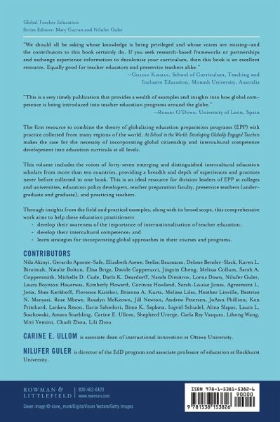 Contributors Nila Akinyi, Gerardo Aponte-Safe, Elizabeth Asewe, Stefan Baumann, Delane Bender-Slack, Karen L. Biraimah, Natalie Bolton, Elisa Briga, Davide Capperucci, Jingxin Cheng, Melissa Collum, Sarah A. Coppersmith, Michelle D. Cude, Darla K. Deardorff, Nanda Dimitrov, Lorna Down, Nilufer Guler, Laura Boynton Hauerwas, Kimberly Howard, Corinna Howland, Sarah-Louise Jones, Agreement L. Jotia, Shea Kerkhoff, Florence Kisirkoi, Brianna Kurtz, Melissa Liles, Heather Linville, Beatrice N. Manyasi, Rose Mbewe, Rosalyn McKeown, Jill Newton, Andrew Petersen, JoAnn Phillion, Ken Pritchard, Lankeu Reson, Ilaria Salvadori, Bima Sapkota, Ingrid Schudel, Alina Slapac, Laura L. Stachowski, Amara Stuehling, Carine E. Ullom, Shepherd Urenje, Carla Rey Vasquez, Lihong Wang, Miri Yemini, Chudi Zhou, Lili Zhou About the Editors Carine E. Ullom, PhD,is the associate dean of instructional innovation at Ottawa University and serves on the editorial board for the Journal of Virtual Exchange. She has over 20 years' experience implementing educational technology in higher education, having served in roles at The University of Kansas and St. Lawrence University (SLU) prior to joining Ottawa University. At SLU, she was the Director of the Language Resource Center. Her research focuses on the impact of GCTL on global identity development among preservice teachers. She is passionate about faculty development regarding developing the globally aware self and internationalization of higher education through embedding intercultural competence development and global awareness capacity building opportunities in courses and programs via virtual exchange. Nilufer Guler, EdD, is director of the EdD program and associate professor of education at Rockhurst University. Her research interests include teacher education, ELL education, and internationalization of teacher education. She was a Global Teacher Education fellow in 2017-18, and she was co-lead on a grant from the Longview Foundation for Promoting Internationalization of Teacher Education Through Faculty Development. Her book Optimizing Elementary Education for English Language Learners was published in 2018, and she is a co-editor for the Globalization of Teacher Education book series at Rowman & Littlefield. Guler also serves on the Global Diversity Committee of AACTE.