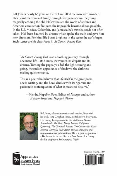 Bill Jones's nearly 65 years on Earth have filled the man with wonder. He's heard the voices of family through five generations, the young magically echoing the old. He's witnessed the world of anthrax and America's cities set on fire, seen the impossible become all too possible. In the US, Mexico, Colombia, and Jamaica, he's traveled roads not often taken. He's been haunted by dreams which spoke the truth and gave him new direction. For him, life burns brightest in the scenes he can't forget. Such scenes are his clear focus in At Sunset, Facing East. "At Sunset, Facing East is an absorbing journey through one man's life-its humor, its wonder, its despair and its dreams. Turning the pages, you feel the light coming and going, the sudden appearance of shadows, the darkness making quiet entrance. This is a poet who believes that life itself is the great poem one is writing, and the book dazzles with its rigorous and passionate contemplation of what it means to be alive." -Kendra Kopelke, Poet, Editor of Passager and author of Eager Street and Hopper's Women