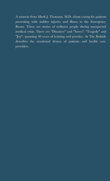 A memoir from Mark J. Thomson, M.D. an emergency physician caring for patients presenting to the ER with sudden illness or injury. The stories begin during his education and training then follow 36 years of practicing emergency medicine. At The Bedside describe the drama and emotions of patients and health care providers during unexpected medical crisis. There are a few "Saves" but many horrible disasters as well. This is a first-hand account of the triumphs and tragedies from a career in emergency medicine.