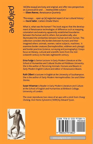 What is, what was the human? This book argues that the making of the human as it is now understood implies a renegotiation of the relationship between the self and the world. The development of Renaissance technologies of difference such as mapping, colonialism and anatomy paradoxically also illuminated the similarities between human and non-human. This collection considers the borders between humans and their imagined others: animals, women, native subjects, machines. It examines border creatures (hermaphrodites, wildmen and cyborgs) and border practices (science, surveying and pornography).