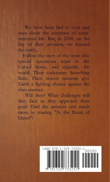 We have been lied to over and over about the existence of extra-terrestrial life. But, in the year 2038, on the day of their invasion, we learned the truth... Follow the story of the most elite special operations team in the United States, arguably the world. Their codename: Scorching Rain. Their newest mission: give Earth a fighting chance against the alien menace. Will they succeed? What challenges will they face as they approach their goal? Find the answers and much more by reading "At the Break of Dawn"!