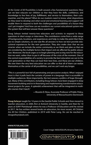"Doug Selwyn has situated children at the center of future educational possibilities, by bringing together an exemplary diversity of authors to help us reflect and transform human lives before it is too late. This array of scholars, educators, and activists will move you to consider the depths of educational possibility in children, youths, subject matters, contexts, and movements. I urge educators at all levels, policy makers, parents, community members, and students themselves to read, ponder, and act on ideas and events compellingly portrayed in At the Center of All Possibilities." -William H. Schubert, Professor Emeritus of Curriculum and Instruction and University Scholar at the University of Illinois at Chicago; Fellow of the International Academy of Education; Lifetime Achievement Award recipient in Curriculum Studies from the American Educational Research Association; and Author of Love, Justice, and Education: John Dewey and the Utopians