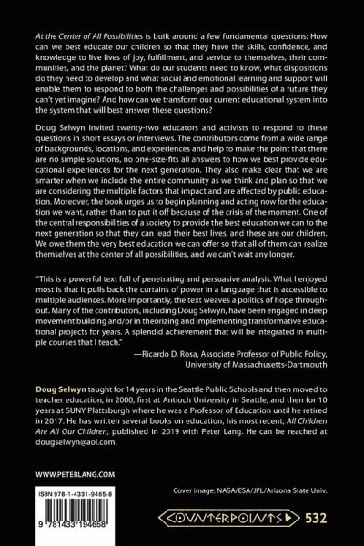 "At the Center of All Possibilities: Transforming Education for Our Children's Future engages a diverse and powerful collection of voices to consider, from intersecting and multidimensional perspectives, the ultimate purpose of education. Core beliefs on this issue drive policy and practice-thus influencing every relationship and interaction in teaching and learning. The messages of contributors should be required reading for anyone who wishes to ensure that education supports the cultivation of humans who can construct a just, equitable world." -Julie Gorlewski, Associate Professor and Department Chair of Learning and Instruction, State University of New York at Buffalo