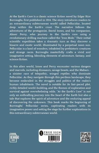 ""At the Earth's Core"" is a thrilling science fiction novel by Edgar Rice Burroughs, renowned for its imaginative premise and gripping narrative. The story follows the adventures of David Innes and Dr. Abner Perry, who embark on a groundbreaking expedition to explore the Earth's core using a remarkable drilling machine called the ""Iron Mole."" As they delve deeper into the unknown depths of the planet, they discover a hidden world filled with prehistoric creatures, strange civilizations, and incredible wonders. Along the way, they encounter perilous challenges and confront hostile inhabitants, including the fearsome Mahars, a race of intelligent reptiles who rule over the subterranean realm. With its blend of thrilling action, imaginative world-building, and thought-provoking themes, ""At the Earth's Core"" captivates readers with its sense of adventure and exploration, transporting them to a realm of excitement and wonder beneath the surface of the Earth.