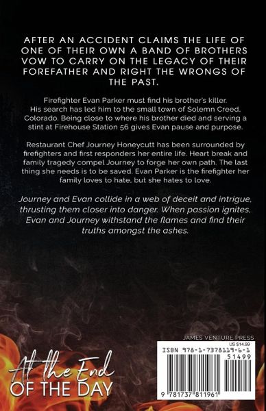 At The End Of The Day: A Firefighter Romance, Sizzling, Steamy Romantic Suspense, Brothers of Solemn Creed Series Passion Ignited Withstanding the flames Lessons in the ashes After an accident claims the life of one of their own, a band of brothers vow to carry on the legacy of their forefather and right the wrongs of the past. Firefighter Evan Parker must find his brother's killer. His search has led him to the small town of Solemn Creed, Colorado. Being close to where his brother died and serving a stint at Firehouse Station 56 gives Evan pause and purpose. Restaurant Chef Journey Honeycutt has been surrounded by firefighters and first responders her entire life. Heartbreak and family tragedy compel Journey to forge her own path. The last thing she needs is to be saved. Evan Parker is the firefighter her family loves to hate, but she hates to love. Journey and Evan collide in a web of deceit and intrigue, thrusting them closer into danger. When passion ignites, Evan and Journey withstand the flames and find their truths amongst the ashes.